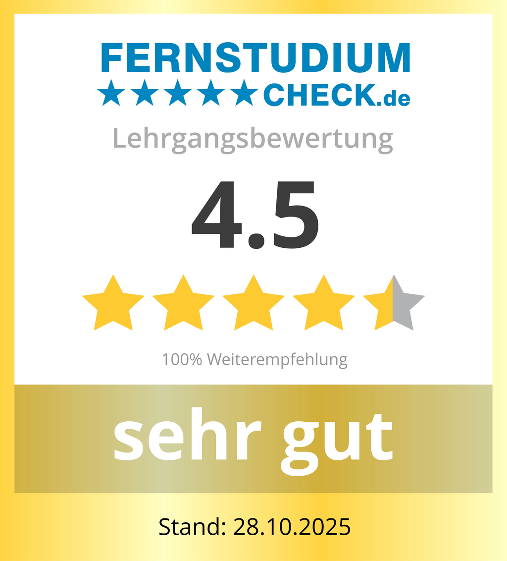 Darüber hinaus werden Ihnen Selbstmanagementtechniken vermittelt, die der erfolgreichen Bewältigung Ihres berufsbegleitenden Fernstudiums dienen.