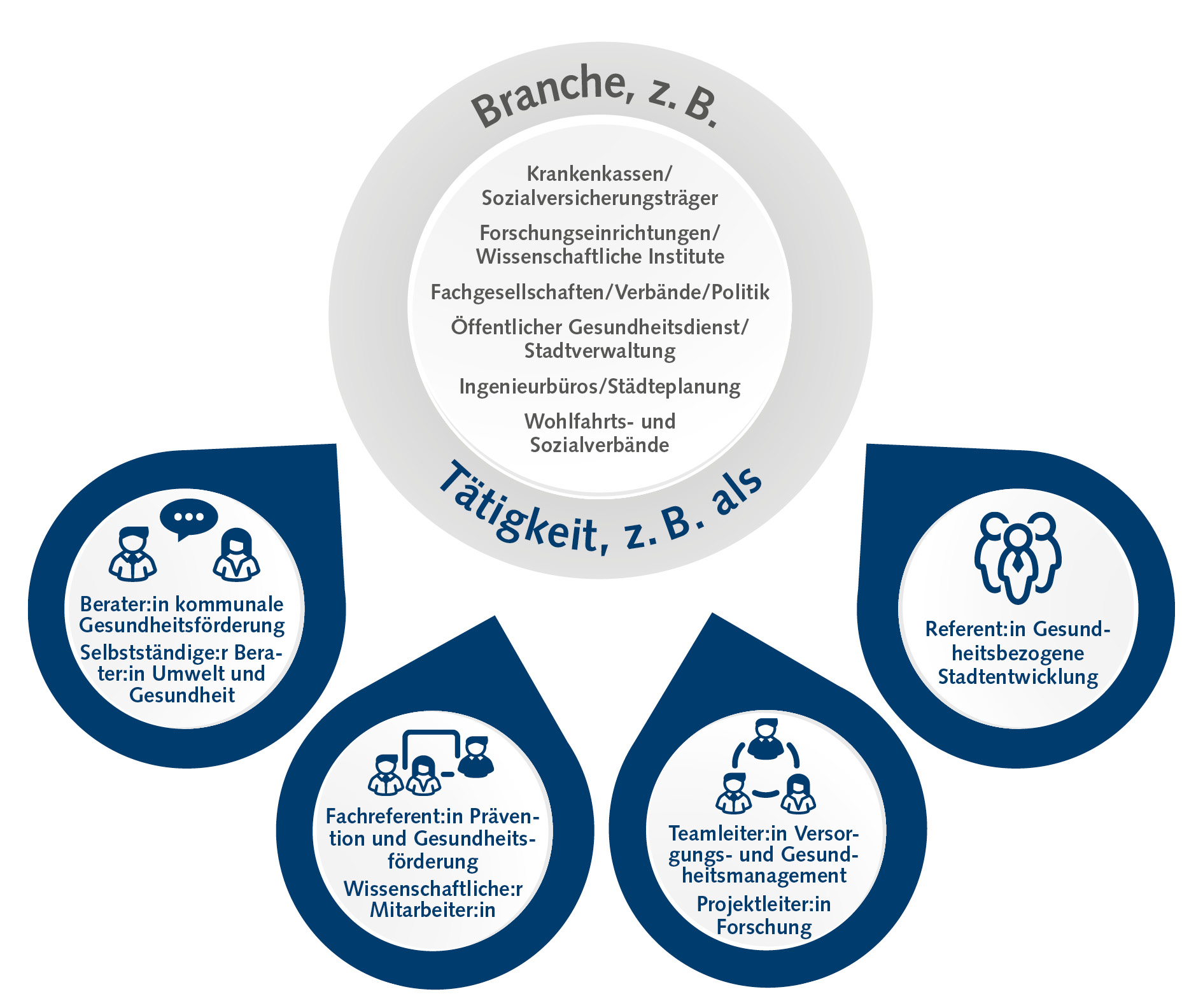 Ob das Unternehmen sind, Kliniken, Krankenkassen, Einrichtungen des Bundes, der Länder und Kommunen oder der Forschung: Auf allen Ebenen bekommt das interdisziplinäre Management der Beziehung von Umwelt und Gesundheit eine tragende Rolle. Gesucht werden Präventionsexpertinnen und -experten, die auch relevante Umwelteinflüsse in den Blick nehmen.